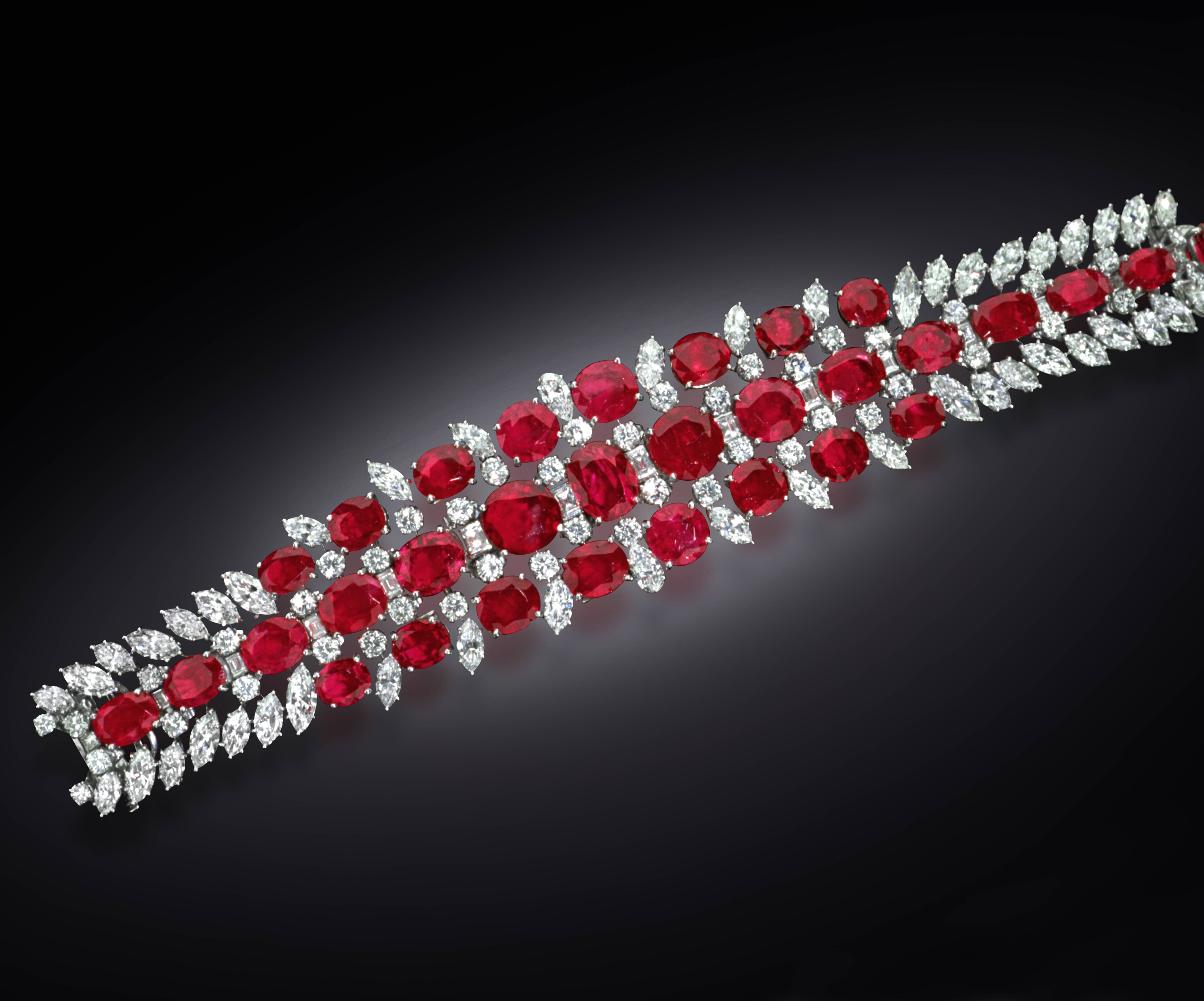 This platinum bracelet contains 31 antique-cut Burmese rubies (totaling 60 carats) possessing the deep, highly-valued color called pigeon's blood. Burma, particularly the region around Mogok, has been a main source for rubies since the late fifteenth century. Rubies from this region are known for their rich and vibrant color, which is why the term "Burmese Ruby" is synonymous with the finest color rubies. A red to slightly purplish-red color, that is medium-dark in tone, with the vibrancy of the color enhanced by a red fluorescence is called pigeon's blood. The rubies in this bracelet were taken from another piece of jewelry and reset by Harry Winston, Inc., in 1950. The original cuts were retained and the stones were reset in a 3-row platinum bracelet with diamonds. The accompanying 107 pear, marquise and round brilliant cut diamonds, total 27 carats. This beautiful bracelet was donated to the Smithsonian in 1961 and is on display in the Gem Gallery at the National Museum of Natural History.