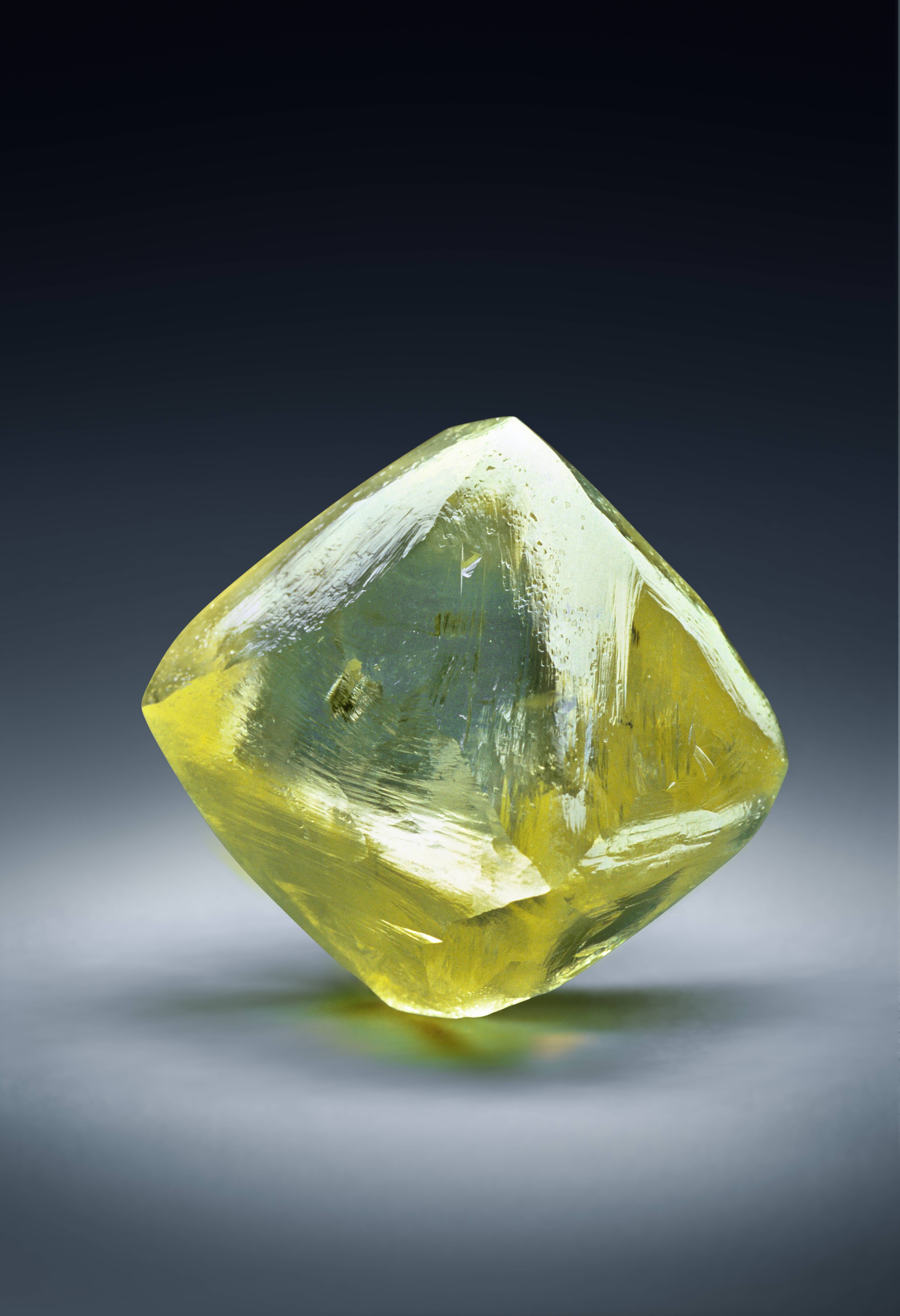The 253.7ct Oppenheimer Diamond is in the shape of an octahedron (an eight-sided double pyramid), which is a common shape for diamond crystals. This diamond is 3.8 cm (1.5 in) in height and was discovered at the Dutoitspan Mine near Kimberley, South Africa in 1964. The yellow color is due to impurities of nitrogen that was substituted for some of the carbon atoms as the crystal formed. The Oppenheimer Diamond is unusual because diamonds of this size are rarely left uncut. It was a gift from Harry Winston and is named in honor of Sir Ernest Oppenheimer, former chairman of the Board of Directors of DeBeers Consolidated Mines.
