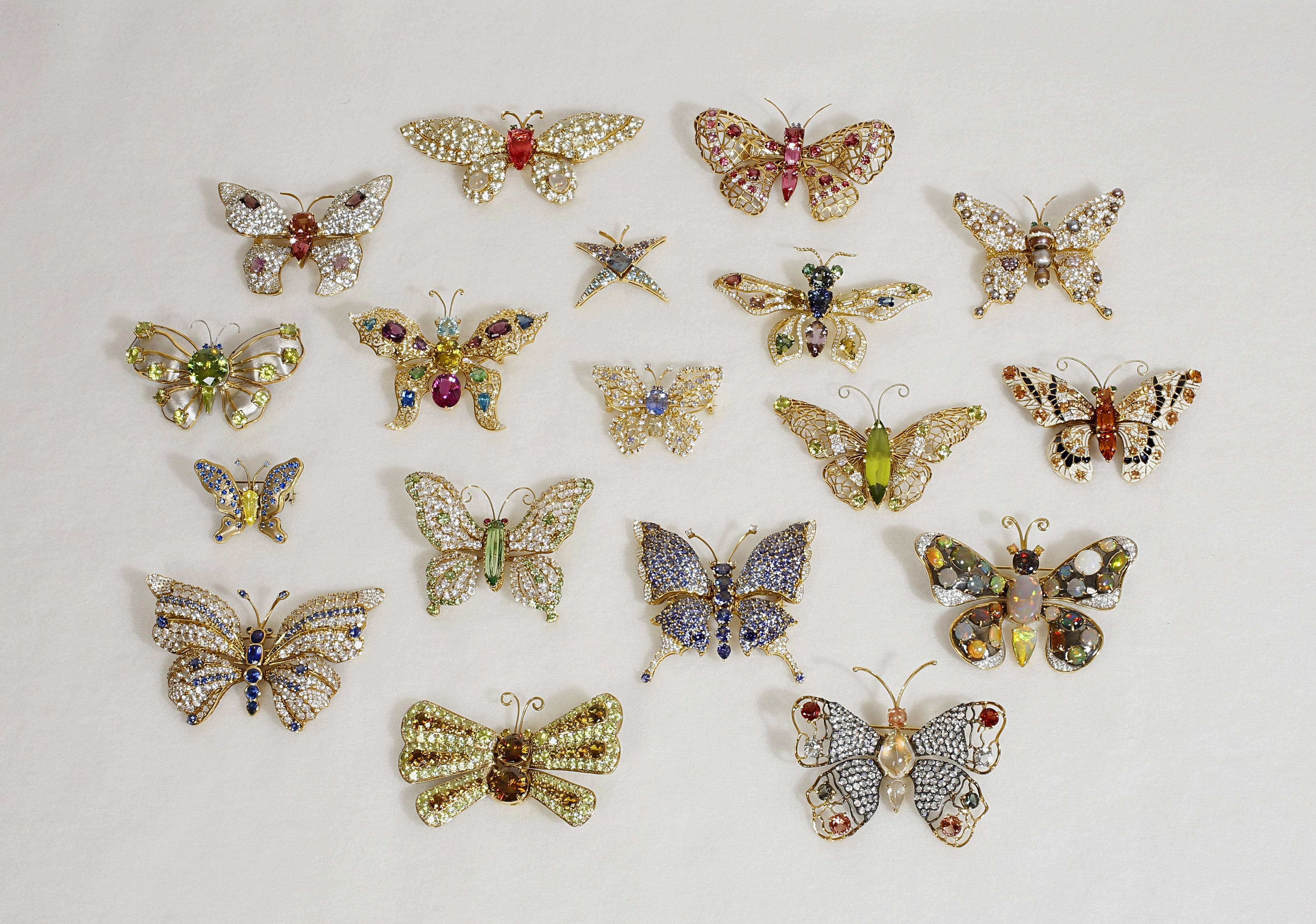 The Alexandrite Butterfly features a faceted 3.48 carat alexandrite gem acquired in Russia. Alexandrite is the variety of chrysoberyl that exhibits the optical phenomenon called color change. The alexandrite shows an outstanding color change from a greenish-blue under fluorescent light to a pinkish-purple under incandescent light. The accent gems are purple scapolites from Tanzania and blue apatites from Madagascar and were chosen as they mirror the colors the alexandrite exhibits under different light sources. The Alexandrite Butterfly is part of a collection of 18 jeweled butterfly brooches created and designed by Elvis "Buzz" Gray and Bernadine Johnston. The butterflies were gifted to the National Gem Collection by the Smithsonian Gem and Mineral Collectors.