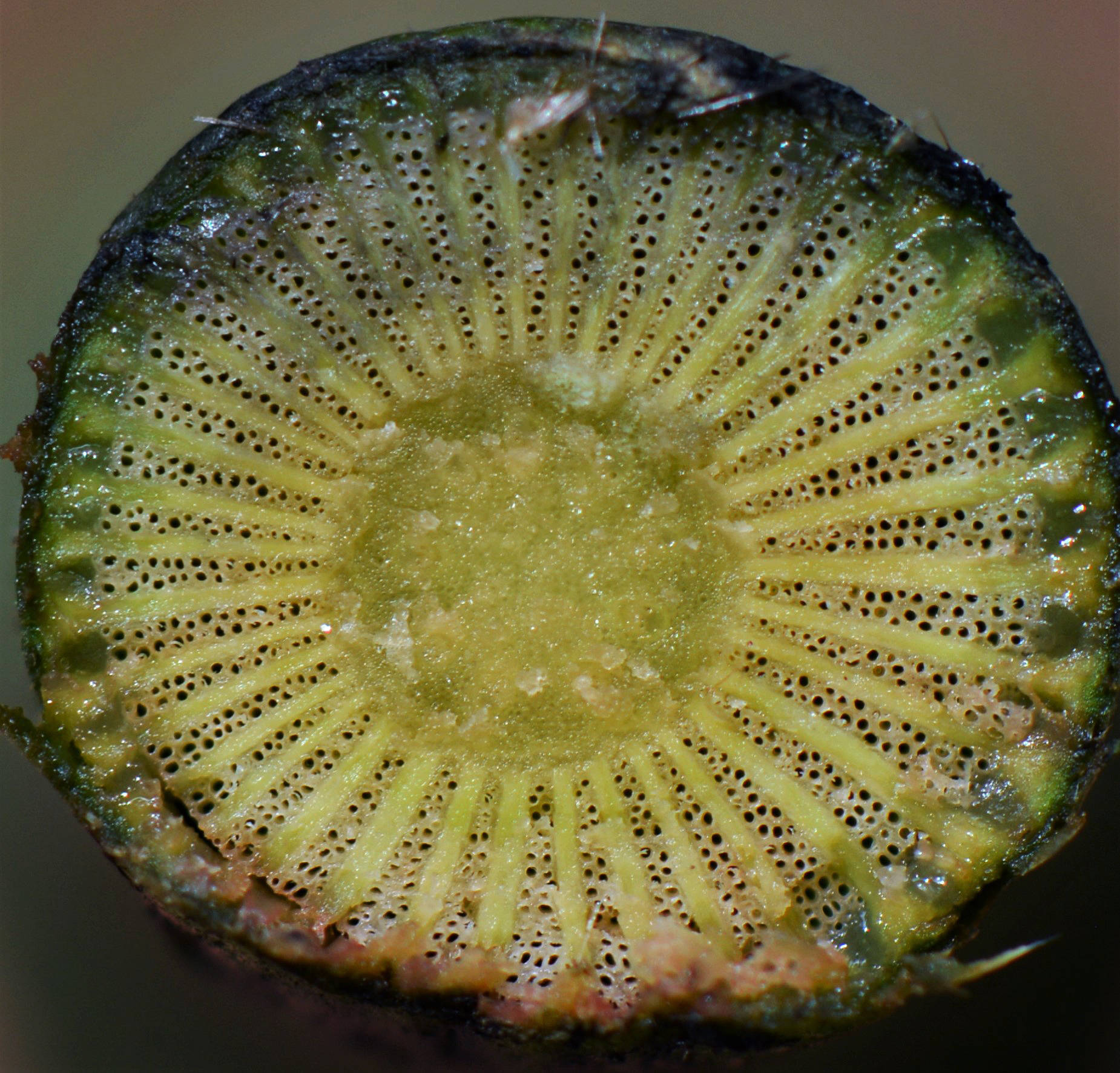 Lianas (woody climbing plants), in contrast to trees and shrubs, usually have stems that have very distinctive anatomical architecture. Trees and shrubs for the most part have stems with a cylindrical core of wood surrounded by the bark (including phloem, periderm, and cortex). Lianas on the other hand, have a complex composition of woody and soft tissues mixed together into a cylindrical, flattened or lobed stem. Cross sections of liana stems reveal great diversity of patterns, many of which are useful in identifying families, genera, and even species of climbing plants. This diversity of structures can be summarized as follows (modified from Angyalossy, Pace & Lima. 2015. Liana anatomy: a broad perspective on structural evolution of the vascular system; pages 253-287. In; Schnitzer et al. (edts). Ecology of Lianas. J. Wiley & Sons, Ltd):